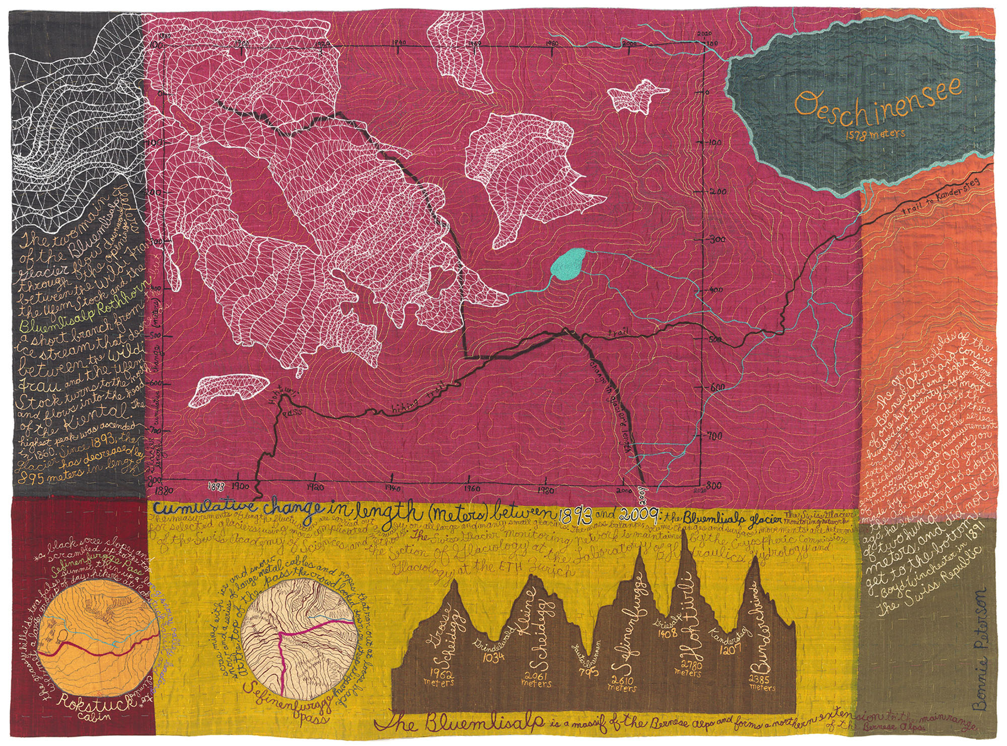 This embroidered silk map shows a section of trail between the towns of Lauterbrunnen and Kandersteg, Switzerland as the trail crosses a steep pass known as Hohturli (“the little door”). After the pass, the Bluemlisalp Glacier spills over a long ridge in several intricate twisted braids of ice, and parallels the trail as the trail descends to the stunning granite-bound Lake Oeschinensee. This embroidery shows the Bluemlisalp glacier’s topography, hiking trails, and melting data.